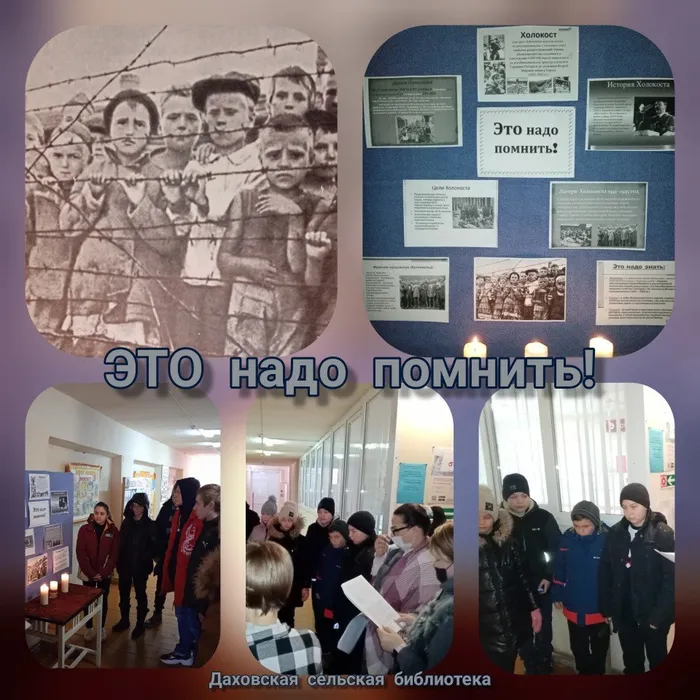 14 января в Даховском СДК библиотекарем совместно с работниками Дома культуры была подготовлена и проведена акция памяти «Это надо помнить!» к Международному дню памяти жертв Холокоста. Целью которой было: формирование толерантного сознания, исторического мышления и сочувствия к жертвам геноцида; формирование патриотизма, гражданственности; ознакомление с хронологией трагедии Холокоста. В ходе мероприятия ребята узнали о Холокосте как страшном, трагическом систематическом преследовании и истреблении немецкими солдатами миллионов жертв нацизма: почти трети еврейского народа и многочисленных представителей других меньшинств, которые подвергались дискриминации, зверствам и жестоким убийствам. Также ребятам рассказали о том, что по приказу Генриха Гиммлера от 27 апреля 1940 года был создан концлагерь Освенцим. 14 июня 1940 г. в него привезли первый транспорт — 728 поляков. На территории Польши, Чехии, Латвии и других восточноевропейских стран существовали также лагеря Майданек, Саласпилс и многие другие. Концентрационных лагерей было около 14 тысяч. В заключение мероприятия ребята почтили минутой молчания всех невинных жертв Холокоста…