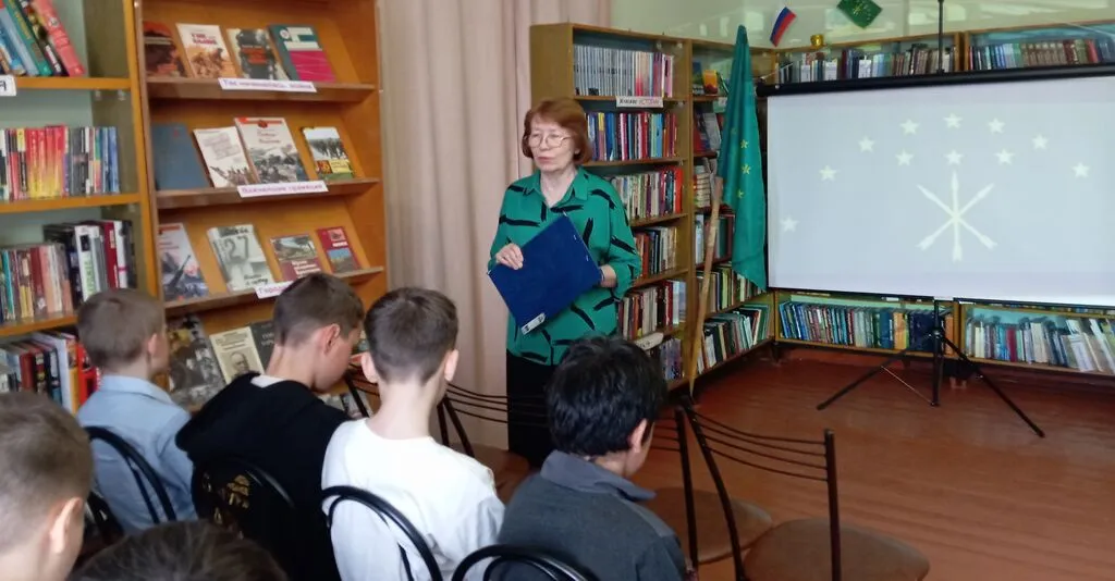 24 апреля в Цветочненской сельской библиотеке для учащихся 5 – 6 –х классов МБОУ «ОЦ №8 Майкопского района» был проведён исторический час «Флаг республики моей». Мероприятие было приурочено ко Дню Государственного флага Республики Адыгея и направлено на знакомство учащихся с историей и символикой флага. Библиотекарь рассказала о значении каждого цвета и символа на флаге, об исторических событиях, которые повлияли на его создание. В рамках мероприятия были использованы видеоматериалы, что позволило сделать информацию более доступной и интересной для школьников. Затем ребята приняли участие в небольшой викторине по истории и символике республики. Цель мероприятия – не только познакомить учащихся с государственным символом, но и воспитать у них чувство патриотизма и гордости за свою республику.