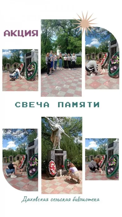 22 июня библиотекарь Даховской сельской библиотеки приняла участие в акции «Свеча памяти», посвященной Дню памяти и скорби - началу Великой Отечественной войны, организованной совместно с работниками СДК. Акция проходила у памятника воинам Великой Отечественной войны станицы Даховской. Организаторы акции рассказали участникам, что эта акция — дань уважения подвигу советских солдат, всех наших соотечественников, погибших в годы Великой Отечественной войны. Каждый желающий мог зажечь свечу, отдав дань уважения тем, кто обеспечил нам мирную жизнь.